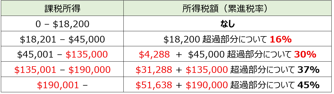 ・オーストラリア居住者及びオーストラリア非居住者ともに前年度(2023-24年度)と比較して減税となっている(前年度からの変更箇所は以下赤字で記載)。