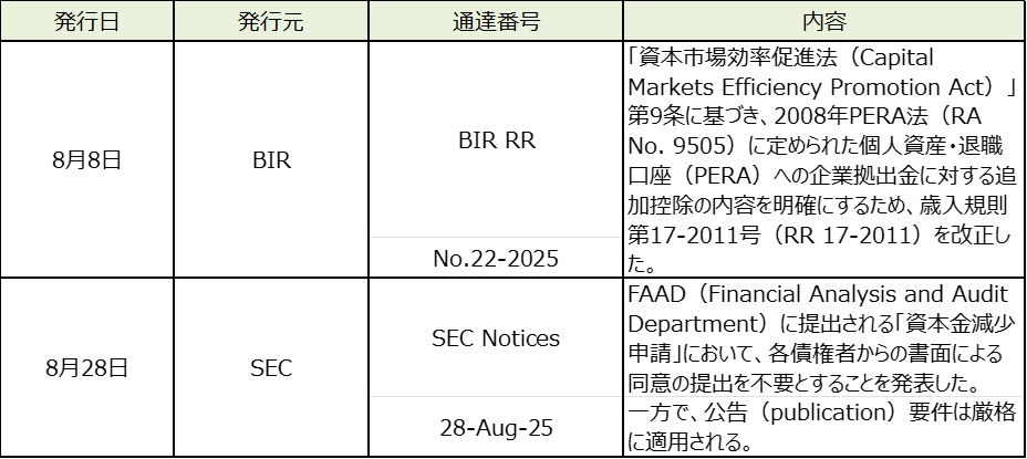 内国歳入庁(BIR)は2025年8月5日に施行規則(RR:Revenue Regulation)No.20を公表した。同規則は、税法第244条および第245条、ならびに「資本市場効率促進法」第17条および第25条に基づき、税法第127条に従って、株式取引税(STT:Stock Transaction Tax)の税率調整および外国証券取引所を通じて売買される国内株式・証券へのSTT課税を実施することを目的としている。