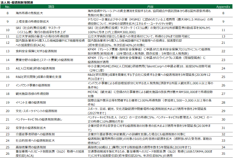 2025年10月10日に2026年度マレーシア予算案が発表されました。2025年上半期、マレーシアのGDP成長率は4.4%であり、アメリカとの関税摩擦などの外的要因がある中でも、2025年のGDP成長率見通しは4.0〜4.8%と見込んでいます。2026年の成長率は4.0〜4.5%であり、世界的な地政学的・経済的不確実性の影響を受けつつも、緩やかなペースで成長すると見込んでいます。今回は、公表された税制改正案の各項目について簡単にご紹介させていただきます。特に、No.12 、No.27、No.33などは日系企業にとっても注目すべき内容と考えられます。