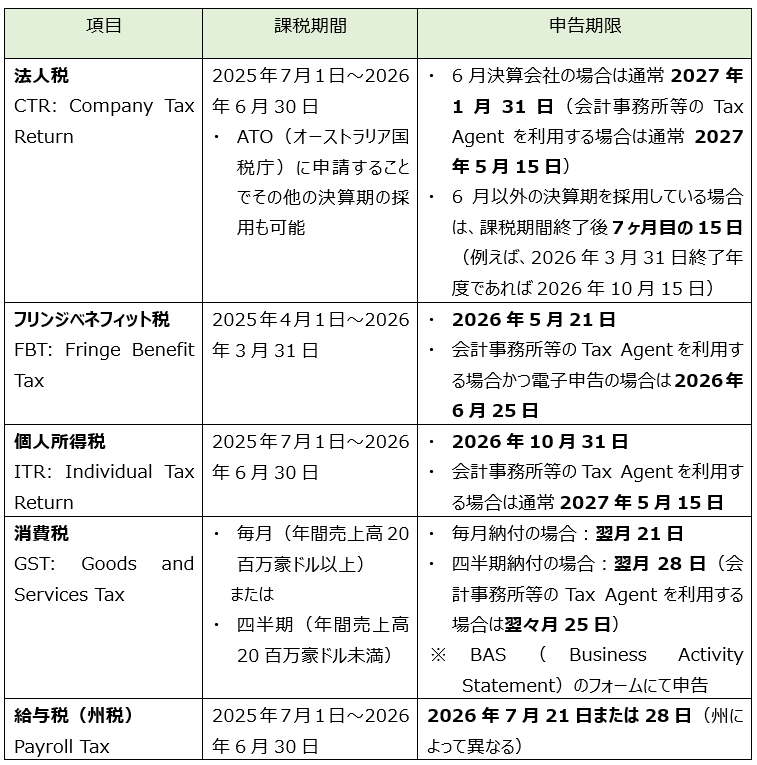 2026年におけるオーストラリアでの各種税務申告期限は以下の通りです。