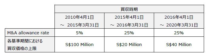 上記の算式におけるM&A allowance rateと買収価格の上限は、M&Aを実行した時期により異なり、まとめると以下のとおりです。